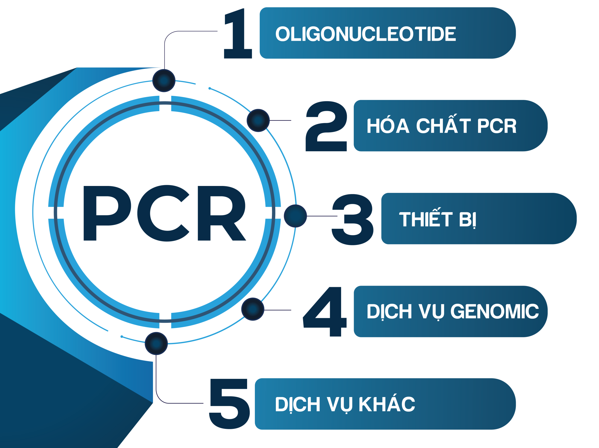 Với giá trị cốt lõi “Đồng hành cùng khoa học Việt”, chúng tôi liên tục cải tiến sản phẩm để đáp ứng nhu cầu thực tiễn của cộng đồng nghiên cứu và đào tạo. Những dấu ấn công nghệ PCR mang đậm bản sắc khoa học Việt bao gồm: các thiết bị phòng thí nghiệm sinh học phân tử như máy luân nhiệt PCR, máy điện di, máy điện di đứng, máy đọc kết quả bằng huỳnh quang Spotcheck, hệ thống tổng hợp và tinh sạch oligonucleotides cùng các hóa chất tùy biến theo nhu cầu Khách hàng như Oligo, PCR Mix và các dịch vụ phân tích trình tự (Sanger, NGS) và tổng hơp gen nhân tạo.